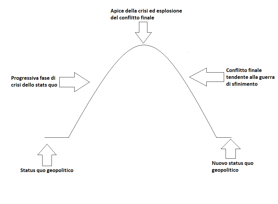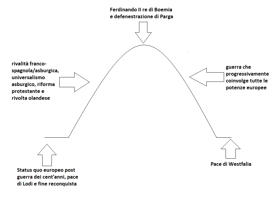 dei trent’anni avremo la seguente evoluzione: status quo a fine quattrocento dovuto alla vittoria francese nella guerra dei cento anni, alla pace di Lodi in Italia e alla fine della reconquista in Spagna – rottura progressiva dello status quo con la nascita della rivalità franco-spagnola/asburgica, progetto universalista asburgico, riforma protestante in Germania ed esplosione della rivolta olandese – apice della crisi con l’elezione a re di Boemia di Ferdinando II e conseguente defenestrazione di Praga – guerra che da conflitto germanico a carattere religioso si evolve in un conflitto europeo a carattere politico – pace di Westfalia che sanziona un nuovo status quo incentrato sulla decadenza della Spagna, il riconoscimento dell’indipendenza delle Province Unite, l’abbandono asburgico del progetto di una restaurazione di un Sacro Romano Impero unitario, la certificazione della divisione della Germania in una serie di staterelli, il primato svedese nell’area nordico-baltica e l’affermazione della Francia come nuova potenza egemone. Il grafico a curva a campana che ho disegnato credo faccia ben comprendere il processo evolutivo status quo – crisi – guerra – nuovo status quo che ho provato a descrivere; basta provare e si può vedere come una curva simile sia applicabile a tutti i conflitti da me sopra citati.