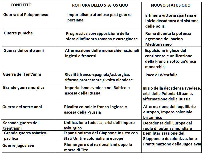 Le due teorie, se così posso permettermi di chiamarle, che ho provato ad illustrare (forse non sempre in modo chiarissimo) in questo articolo, cioè il sistema crisi geopolitica-conflitto finale e la conseguente rilettura del 1914-1945 come un unico conflitto, non hanno la presunzione di essere verità rivelata o la rivoluzione copernicana della storiografia. Si tratta di un contributo di idee e riflessioni da me maturate che ho voluto portarvi non per ottenere una standing ovation, ma per aprire un dibattito dato che, io per primo, riconosco che rimangono delle aree non cristalline nella mia analisi e delle conclusioni che possono produrre una duplice lettura. Concludo allegando una tabella in cui provo a fare una sintesi dell’applicazione delle mie idee ai nove conflitti da me sopra indicati e dando la rassicurazione che, pur con l’intenzione di continuare ad allargare questo discorso con ulteriori contributi, continuerò a portarvi articoli di pura divulgazione storica nei quali ovviamente le mie analisi saranno, come ho sempre fatto, accompagnate dagli altri orientamenti storiografici.