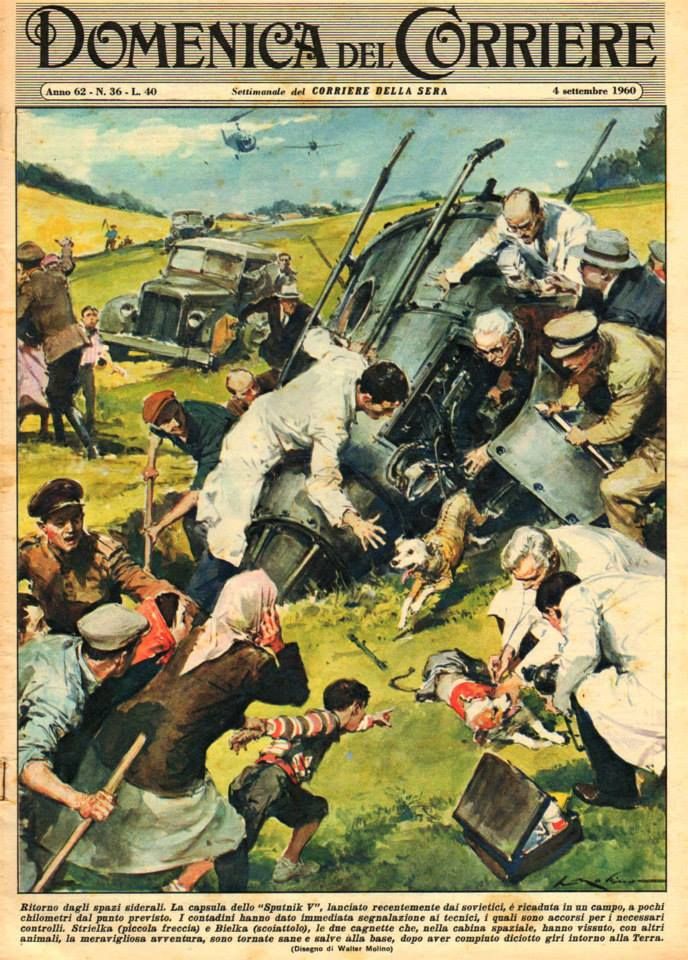 apparecchio radiotrasmittente. Il suo nome è Sputnik, che in russo significa “compagno di viaggio”.”; poco dopo ancora la radio annuncia “E ora ascoltate, questa è la voce dello Sputnik 1..”, qualche secondo di silenzio e poi un distinto “bip… bip… bip…”. Per gli Stati Uniti fu un calcio nei denti perché era impossibile negare che i sovietici li avevano fatti fessi; in un attimo la fiducia quasi fideistica nella supremazia tecnologia dell’America venne affondata su entrambe le sponde dell’Atlantico che si svegliavano con in orbita una luna rossa. Nonostante i tentativi dell’amministrazione Eisenhower di minimizzare l’evento l’impressione nell’opinione pubblica fu immensa anche perché il tentativo di far passare lo Sputnik come nient’altro che una palla d’alluminio con quattro antenne venne rapidamente ridicolizzato dalla stampa. Il problema non era solo della sconfitta scientifica, ma anche del timore che i russi avessero raggiunto un avanzamento nella tecnologia missilistica tale da fargli avere un bel po’ di metri di vantaggio nella corsa agli armamenti. In realtà come abbiamo visto il razzo R-7 era ancora a livello di mero prototipo e non c’era alcuna possibilità che potesse portare una testa nucleare su una città americana, ma lo shock fu tale che la Casa Bianca fu bombardata di critiche da parte di Senato e Congresso per aver tirato i remi in barca in un campo decisivo come quello degli armamenti. Nacque il così detto missile gap, cioè il timore da parte delle due super potenze che una potesse conseguire un primato assoluto nell’ambito degli ICBM tale da annullare l’effetto di deterrenza del armamento nucleare della controparte, che avrebbe determinato le politiche strategiche tanto degli Stati Uniti che dell’URSS fino alla fine della guerra fredda. Miglior risposta venne dalla comunità scientifica internazionale che, dopo lo stupore, rimase estasiata dal fatto che finalmente l’umanità fosse riuscita a superare il limite della Terra per avventurarsi nello spazio; la dimostrazione che era possibile portare un oggetto stabilmente in orbita apriva un oceano di possibilità di scoperte scientifiche. Krushev rimase sbalordito dalla reazione sia interna che internazionale provocata dalla Sputnik e quindi decise di cavalcare l’onda chiedendo a Korolev di organizzare un secondo lancio per celebrare l’anniversario della Rivoluzione d’Ottobre. Il leader sovietico pensava a un nuovo satellite che fosse in grado di trasmettere le note dell’Internazionale, ma Korolev, poco interessato alla propaganda, riteneva che un oggetto del genere non sarebbe stato altro che una versione 2.0 del primo Sputnik senza alcuna utilità scientifica. Il progettista capo aveva invece in mente qualcosa di più ambizioso: mettere in orbita un essere vivente. Tanto l’URSS quanto gli Stati Uniti avevano sin dagli inizi degli anni ’50 avevano avviato dei programmi in cui venivano usate cavie animali per simulare le situazioni in cui si sarebbe trovato un essere umano durante un volo suborbitale ed orbitale. Gli americani scelsero le scimmie mentre i russi delle cagnette selezionate allo scopo nell’Istituto Pavlov di Leningrado; un altro gruppo di animali, considerati sacrificabili, vennero invece usati per condurre ricerche sulla fisiologia e tarare al meglio l’apparecchiatura che si sarebbe utilizzata per “l’elité”. Il 3 Novembre 1957 lo Sputnik 2 viene messo in orbito e stavolta si trattò di ben altro che una palla di alluminio con quattro antenne; il nuovo oggetto infatti aveva la forma di un cono a tre stadi: nel primo trovavano posto due esprimenti per la misurazione delle radiazioni X e ultraviolette nell’alta atmosfera, nel secondo vi erano le antenne radio mentre nel terzo era stato creato un alloggio dove prese posto una cagnetta bastardina di due anni chiamata inizialmente Kudrjavka, ma che poi per semplificare verrà ribattezzata Laika. I russi non sono subito chiari sul fatto che la “missione” di Laika sia senza ritorno e quando ciò divienne chiaro