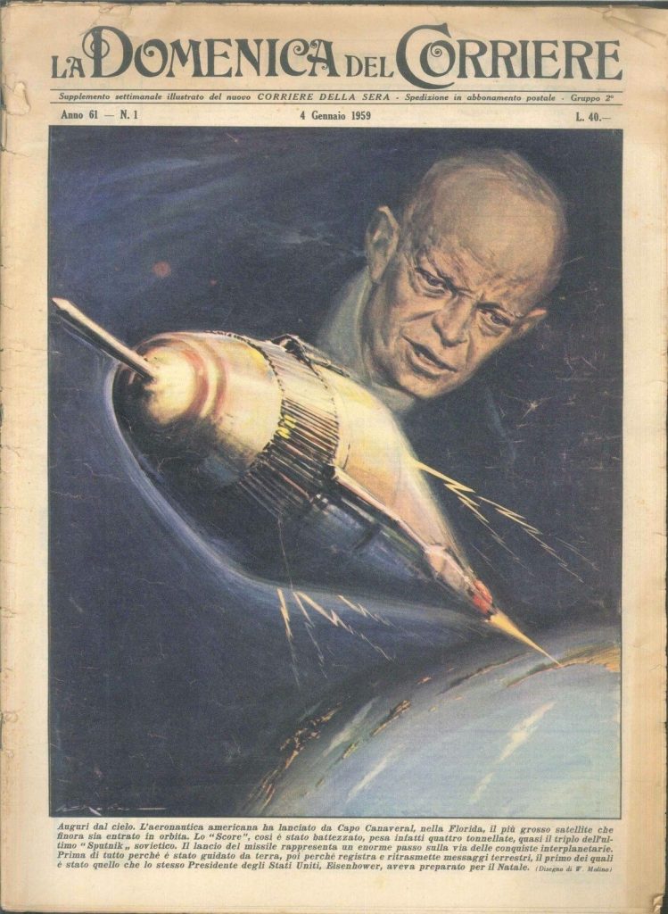 Nel 1865 Jules Verne pubblica il suo “Dalla Terra alla Luna” in cui immaginava l’organizzazione di una missione con equipaggio umano allo scopo di raggiungere il nostro satellite. Non era la prima volta che un letterato raccontava di un viaggio verso la Luna, già Ariosto alla fine dell’ “Orlando Furioso” vi fa andare Astolfo in sella a un ippogrifo per recuperare il senno di Orlando, ma il racconto di Verne è particolare perché si tratta di una delle prime opere in cui questo genere di viaggio non ha carattere fantastico o poetico bensì è inteso come il risultato del progresso scientifico del genere umano. Sebbene il racconto sia molto bello il metodo teorizzato da Verne, sparare un proiettile attraverso un gigantesco cannone, venne ben presto ritenuto irrealizzabile dai tecnici perché non solo l’accelerazione dello sparo sarebbe stata troppo forte, al punto di schiacciare e uccidere gli uomini all’interno del proiettile, ma sempre il proiettile avrebbe finito per distruggersi nell’attrito con gli strati più densi dell’atmosfera. Già agli inizi del novecento due uomini, Robert Goddard in America e Konstantin Tsiolkowski in Russia (guarda caso proprio nei paesi che sarebbero stati protagonisti della corsa allo spazio), immaginarono per primi la possibilità di raggiungere la Luna attraverso un razzo, ma fu solo dopo la seconda guerra mondiale che la tecnologia necessaria a tentare l’impresa fu a disposizione. La biografia-intervista di Wernher Von Braun scritta da Bernd Ruland s’intitola “La mia vita per lo spazio”, uno scrittore inglese acidamente disse che magari bisognava aggiungere “anche se di tanto in tanto colpisco Londra”. Risulta infatti innegabile che il grande balzo nello spazio degli anni cinquanta fu possibile solo partendo dalle V2 tedesche cioè i missili che, nell’immaginario di Hitler e Goebbels, avrebbero dovuto radere al suolo le citta della Gran Bretagna. A guerra finita tanto gli Stati Uniti che l’URSS, pur di reclutare gli ex-scienziati del Terzo Reich, furono ben disposti a chiudere un occhio sulle loro eventuali implicazioni nei crimini di guerra del nazismo; le V2 infatti venivano assemblate nel campo di concentramento di Dora – Mittelbau e quindi almeno sui 20.000 morti di questo lager i responsabili del programma missilistico tedesco non possono dirsi privi di colpa. Con i progetti della V2 in mano le due super potenze iniziarono a costruire i loro rispettivi missili balistici per lanciarsi vicendevolmente testate nucleari, ma alcuni gruppi di scienziati cominciarono anche ad investigare la possibilità di usare i medesimi vettori per mettere in orbita un satellite artificiale. L’ora giusta sembrò suonare alla metà degli anni ’50 quando il Consiglio internazionale delle società scientifiche si era augurato che, in occasione dell’Anno geofisico internazionale indetto tra il 1957 e il 1958, fosse possibile lanciare un satellite per esplorare lo spazio. Solo un anno prima questa dichiarazione il fumettista belga Hergé aveva fatto atterrare sulla Luna il suo Tintin a bordo di un razzo molto simile a una V2. Confidando sulle capacità tecnico-scientifiche del suo paese il Presidente Eisenhower affermò il 29 Giugno 1955 che gli Stati Uniti sarebbero stati i primi a centrare l’obiettivo; l’affermazione scatenò un’euforia collettiva nel mondo occidentale perché si era convinti che se c’era qualcuno che poteva riuscire nell’impresa quelli erano proprio gli Stati Uniti. Fu forse questo eccesso di fiducia nei propri mezzi che fece in modo che gli americani se la prendessero comoda convinti di non essere in gara con nessuno; Eisenhower infatti per prima cosa dovette decidere chi sarebbe stato a portare avanti il progetto: l’Esercito coi suoi missili balistici Redstone e Atlas oppure la Marina con il razzo Vanguard? Temendo che il coinvolgimento dell’esercito avrebbe favorito una militarizzazione dello spazio decise di ignorare le raccomandazioni di Von Braun, il quale lavorava per l’esercito, affidando il lavoro alla Marina visto che il Vanguard era “scienza pura” senza implicazioni militari. Von Braun sapeva che il programma Vanguard non aveva assolutamente le caratteristiche per mettere in orbita qualcosa per cui tentò di aggirare l’ordine del Presidente lanciando nel Settembre 1956 lo Jupiter C II; il razzo polverizzò tutti i record, ma all’accensione dell’ultimo stadio, quello che avrebbe dovuto portare il satellite in posizione, i motori fecero cilecca. La colpa non era però dell’ingegnere tedesco bensì di un sabotaggio ad opera dello stesso esercito americano; il Pentagono infatti, saputo di ciò che stava facendo Von Braun, lo convocò a rapporto per fargli una lava di testa e allo stesso tempo inviò degli uomini perché svuotassero i serbatoi del quarto stadio del razzo. La marina così rimase sola e, coma predetto da Von Braun, i primi lanci del Vanguard ebbero risultati molto modesti così che alla vigilia della scadenza indicata da Eisenhower il massimo che il razzo poteva portare era quello che la stampa poi avrebbe chiamato un “pompelmo spaziale” da 9 chili. Ma tanto nessuno gli correva dietro… oppure no? L’ambiziosa affermazione del Presidente americano infatti non aveva solo provocato plaudenti entusiasmi, ma anche una criptica risposta della sua controparte sovietica Nikita Krushev “Noi non cantiamo mai prima di aver fatto l’uovo.”. Una successiva affermazione del 2 Agosto 1955 di Leonid Sedov al congresso degli astronauti di Copenhagen in cui si annunciava che l’URSS avrebbe lanciato un satellite in tempi brevi non fu presa in grande considerazione ritenendola una mera ripicca alle affermazioni americane; in realtà anche i sovietici avevano avviato un loro programma spaziale e le parole di Eisenhower lo aiutarono a superare i suoi primi ostacoli. Se negli Stati Uniti infatti il problema era Esercito o Marina, in Russia era invece convincere il Partit