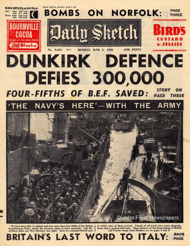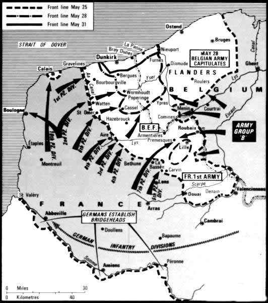 salvo in un tempo massimo di due giorni. Superato questo intervallo infatti era presumibile che i tedeschi avrebbero reso l’evacuazione impossibile e lo stesso Churchill, parlando alla camera, disse di tenersi pronti a “notizie gravi e dolorose…”. In effetti entro il 27 Maggio meno di 10.000 uomini erano stati imbarcati, ma a questo punto intervennero due circostanze decisive che trasformarono Dunkerque da una probabile disastro a un miracolo: primo i tedeschi rimasero immobili ben più dei due giorni pronosticati, secondo accanto alla Royal Navy venne in soccorso del B.E.F., ammucchiato sul porto e nelle spiagge, una flotta di pescherecci, lance dei pompieri e piccole imbarcazioni da crociare che, sotto l’incessante attacco della Luftwaffe, si prodigarono per portare a largo quanti più soldati possibile. Gort fu altresì abilissimo a creare un perimetro difensivo che si batté accanitamente per guadagnare ogni secondo e il 29 Maggio la Flotta francese giunse a dare una mano così che il 31 Maggio la quota giornaliera di imbarcati era salita a 68.014. Il 4 Giugno l’Operazione Dynamo venne dichiarata conclusa e a sbarcare sulle coste inglesi furono un totale di 338.000 uomini, tra i quali 110.000 francesi, al prezzo di sei cacciatorpediniere inglesi, due francesi e molte navi minori. Mentre ciò avveniva sul fronte alleato il 27 Maggio veniva infine ritirato l’ordine di stop ai panzer che finalmente, dopo altre sedici ore di preparativi, poterono superare l’Aa e rimettersi in marcia. Ormai però la situazione era irrimediabilmente cambiata: se il 24 a difesa del perimetro di Dunkerque c’era a malapena un battaglione inglese adesso i tedeschi si trovarono ad affrontare l’accanita resistenza predisposta da Gort e della troppo poco ricordata retroguardia francese della 1° armata che si sacrificò, venendo infine circondata e costretta ad arrendersi, per tenere il nemico bloccato a soli 20 km dalle spiagge. Nonostante si fosse trattato di una fuga che per poco non si era trasformata in un completo disastro l’evacuazione del B.E.F. e delle truppe francesi fu accolto in Inghilterra come un gigantesco successo; si era ancora vivi per combattere un altro giorno, anche se in Francia la si avvertì solo come una sorta di defezione da parte dell’alleato e ciò avrebbe incoraggiato i militari del partito della capitolazione. Al Parlamento inglese Churchill, dopo aver elogiato l’incredibile risultato ottenuto, riportò tutti alla dura realtà affermando che non si doveva dare a Dunkerque gli attributi della vittoria perché “le guerre non si vincono con le evacuazioni”, ma pochi minuti dopo questa doccia fredda gonfiò l’orgoglio inglese lanciando la parola d’ordine “Noi combatteremo sulle spiagge, noi combatteremo nei luoghi di sbarco, noi combatteremo sui campi e sulle strade, noi combatteremo sulle colline; noi non ci arrenderemo mai!” e certamente sarebbe stato ben più difficile farlo se invece di un’evacuazione di successo avesse avuto 338.000 soldati morti o prigionieri dei tedeschi.